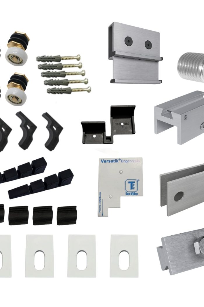 Kit Box p/ vidros laminado e temperado · Roldanas com um exclusivo Sistema de Pinças · Não usa furos e recortes nos vidros.